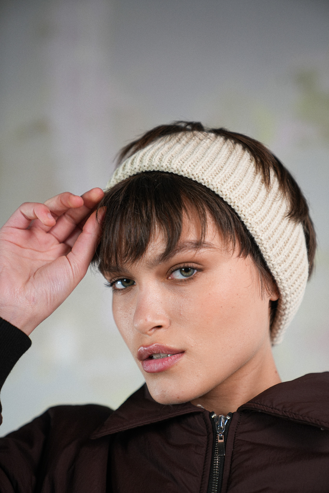A cream-colored knitted headband is a stylish alternative to a hat. Soft, warm, and pleasant to the skin, it protects your ears from the cold and doesn't ruin your hairstyle. It goes perfectly with a coat, down jacket, or sweater in the same color. Created for those who appreciate minimalism, comfort, and bright accents in their look.
