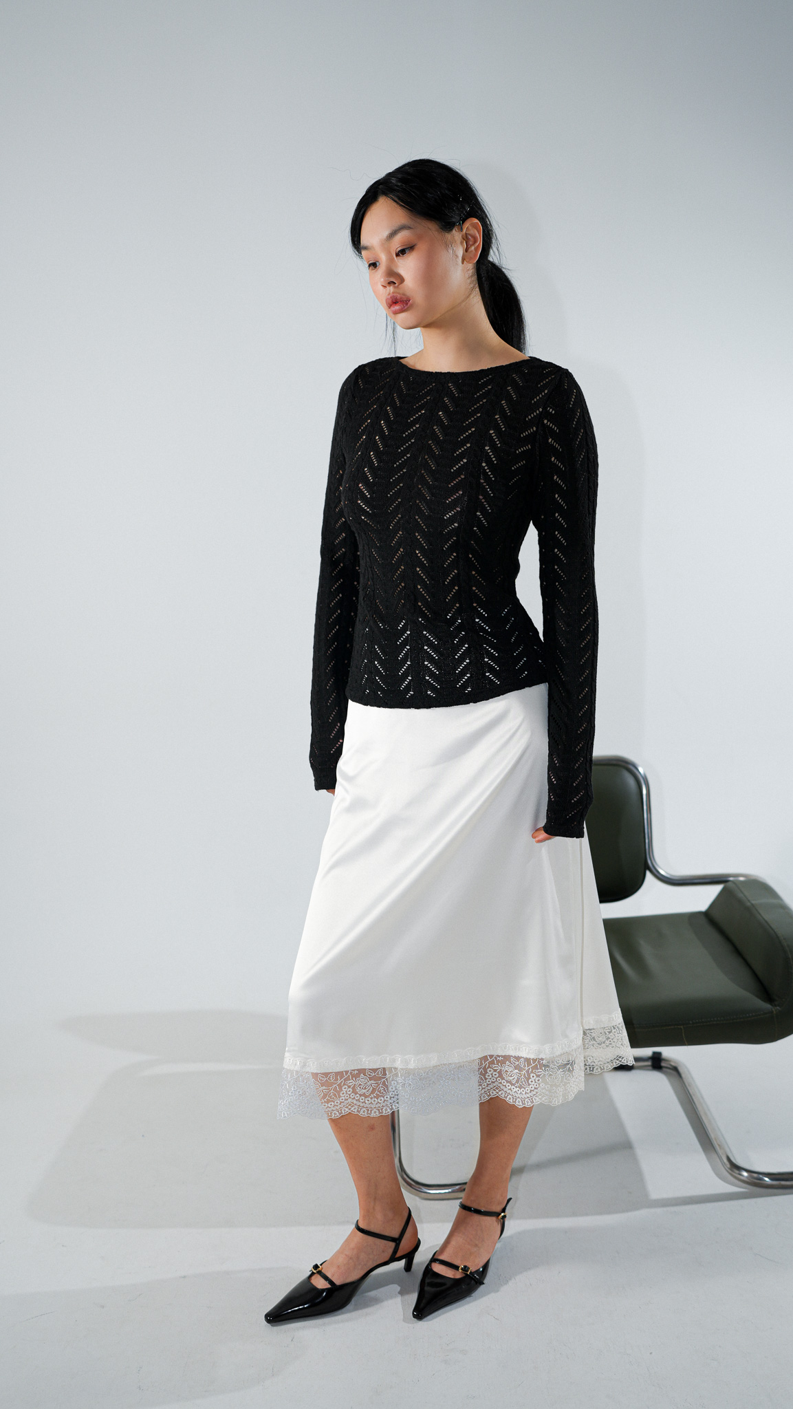 Ажурний лонгслів із тонкого трикотажу поєднує мінімалізм і делікатну фактуру. Напівпрозорий візерунок створює легкий силует і додає образу витонченості.
