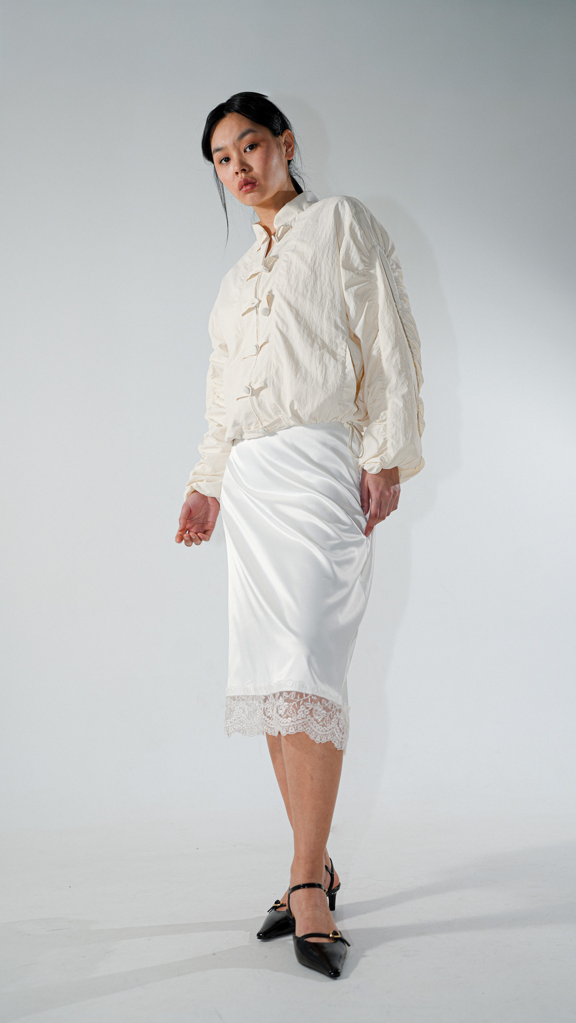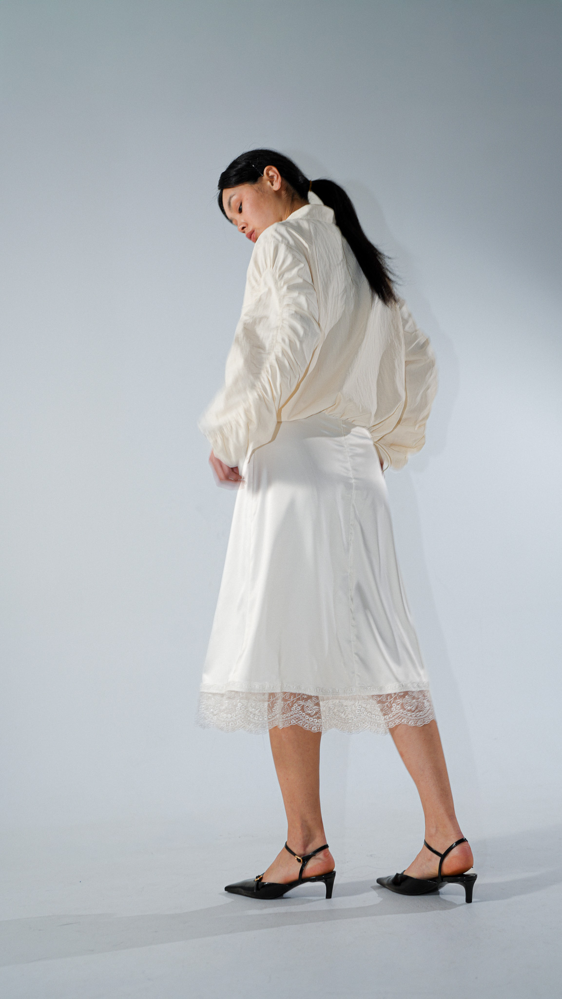 Атласна спідниця з мереживом на подолі стане універсальним елементом гардеробу, який додає образу м’якості, елегантності та легкої романтичності.