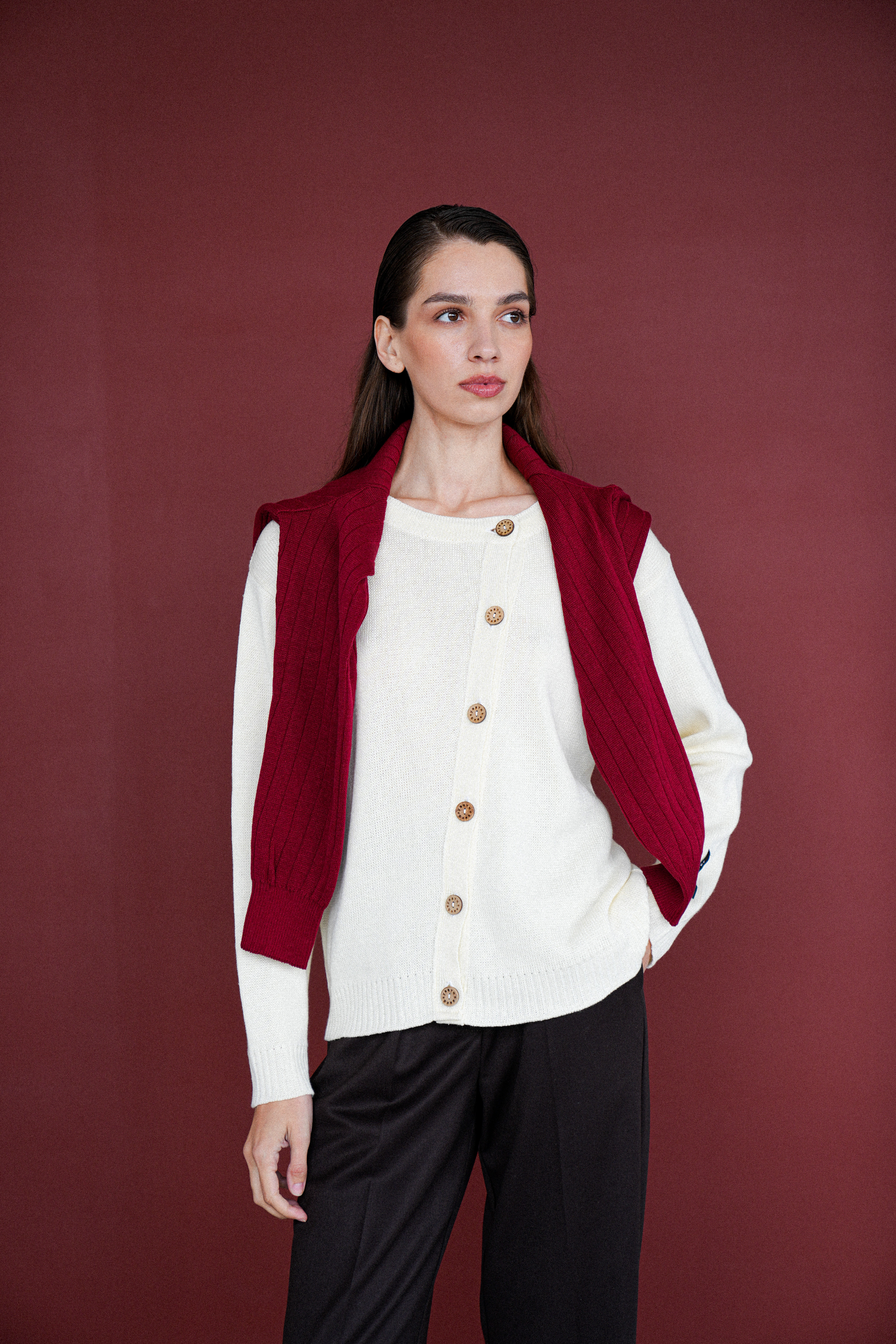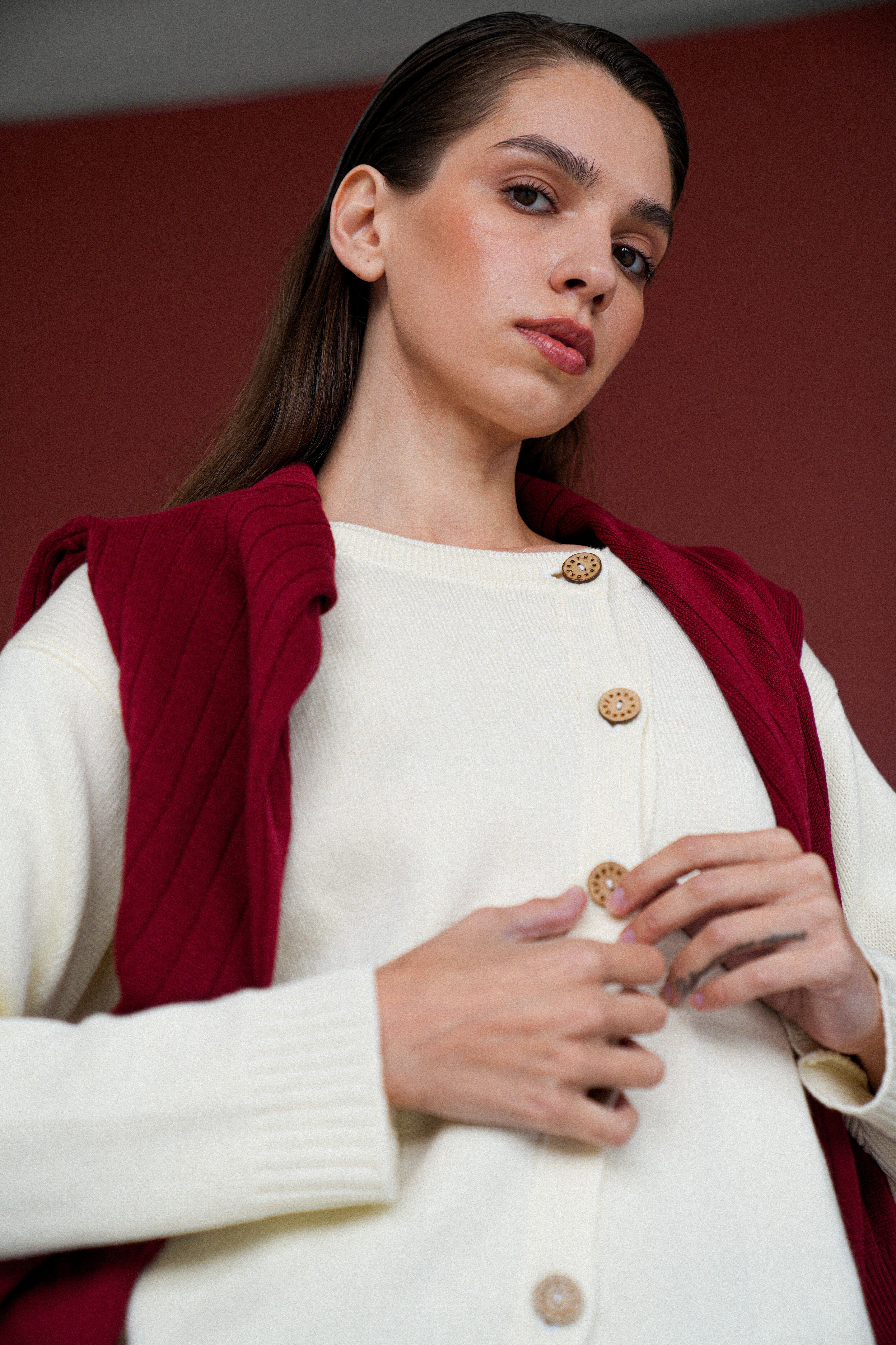 Кардиган легко поєднувати з джинсами, спідницями чи класичними брюками. Молочний відтінок підходить як до світлих, так і до контрастних кольорів, тому ви зможете створювати десятки стильних комбінацій. Це ідеальний вибір для офісу, прогулянок чи вечірніх зустрічей.